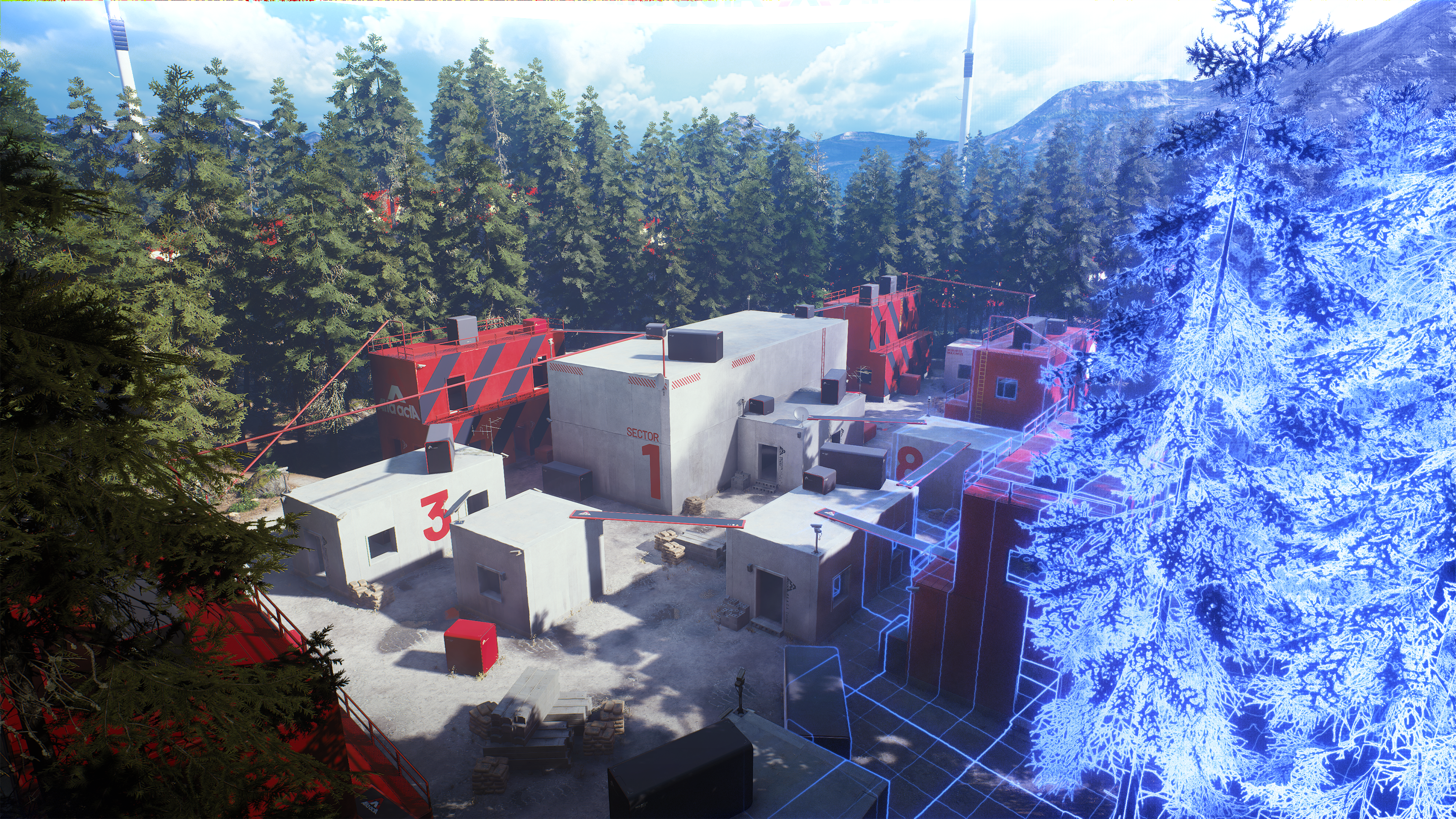 This glitchy, neon-filled cityscape exists in the loading realm of the game show and features voxel bridges and glitched geometry. Partially loaded and out-of-place, SYS$HORIZON is a sight to behold, especially at night.
