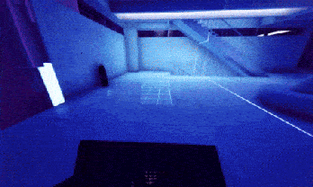 While the gadget is held, looking at a surface will show an indicator of a potential dematerialization as a blue hologram covering a part of the surface. The primary trigger can be used to activate the gadget and dematerialize the surface.